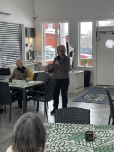 Seniorkommitténs ordförande Yvonne Thunman drar igång med att berätta om vad vi skulle få uppleva under dagens sopplunch.